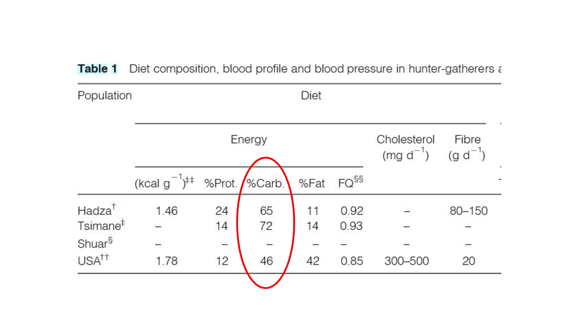 A Hadza törzs szénhidrátfogyasztása a napi összenergiafogyasztásuk 65 százaléka, a Tsimane néptörzsé 72 százalék, míg az amerikaiaké átlagosan 46 százalék. Forrás: Pontzer és mtársai (1)