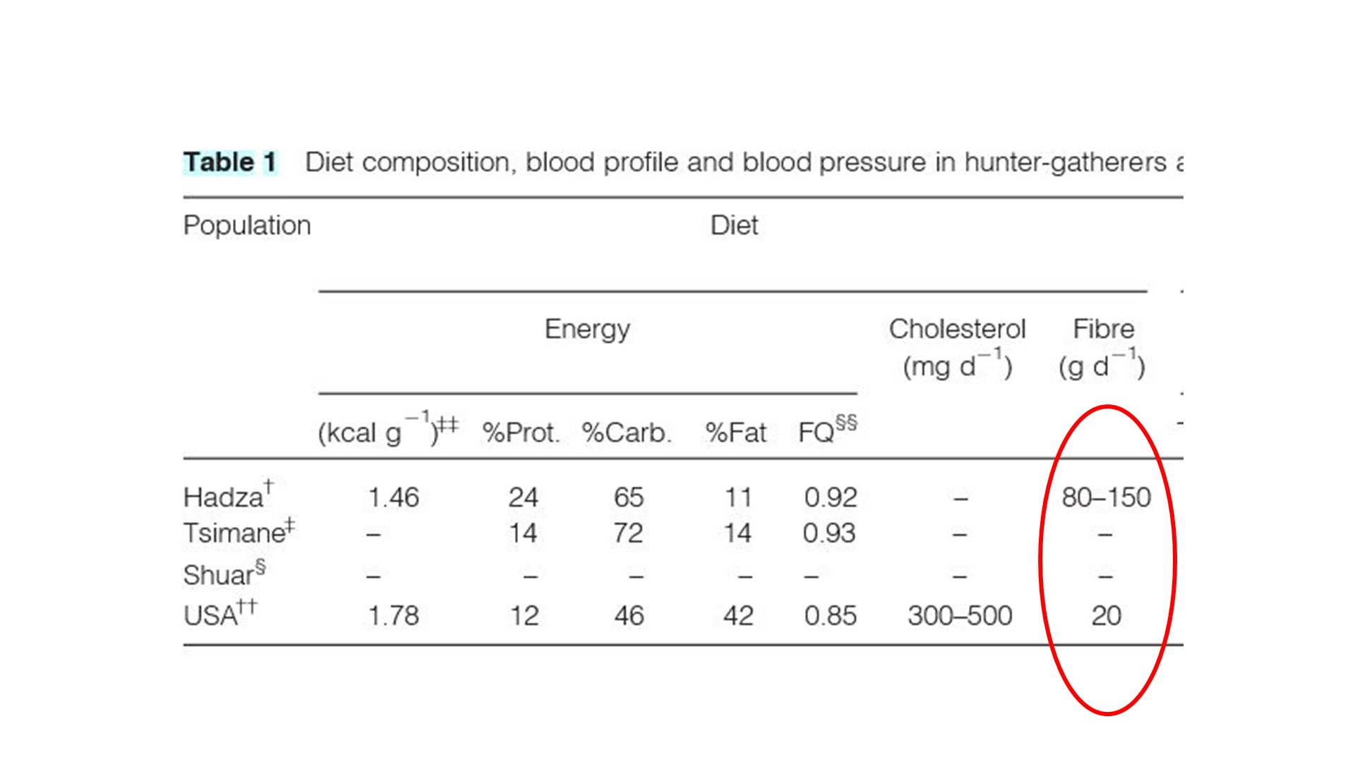 A Hadza törzs napi 80-150 g rostot fogyaszt, szemben , amerikai átlagos 20 grammal. Forrás: Pontzer és mtársai (1)