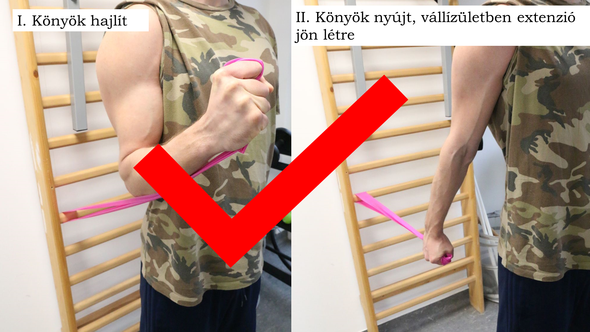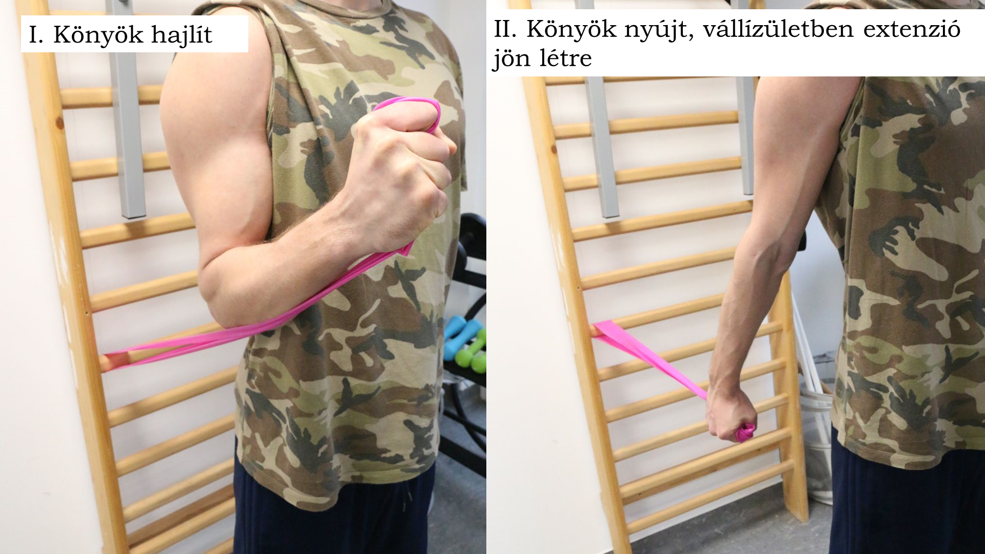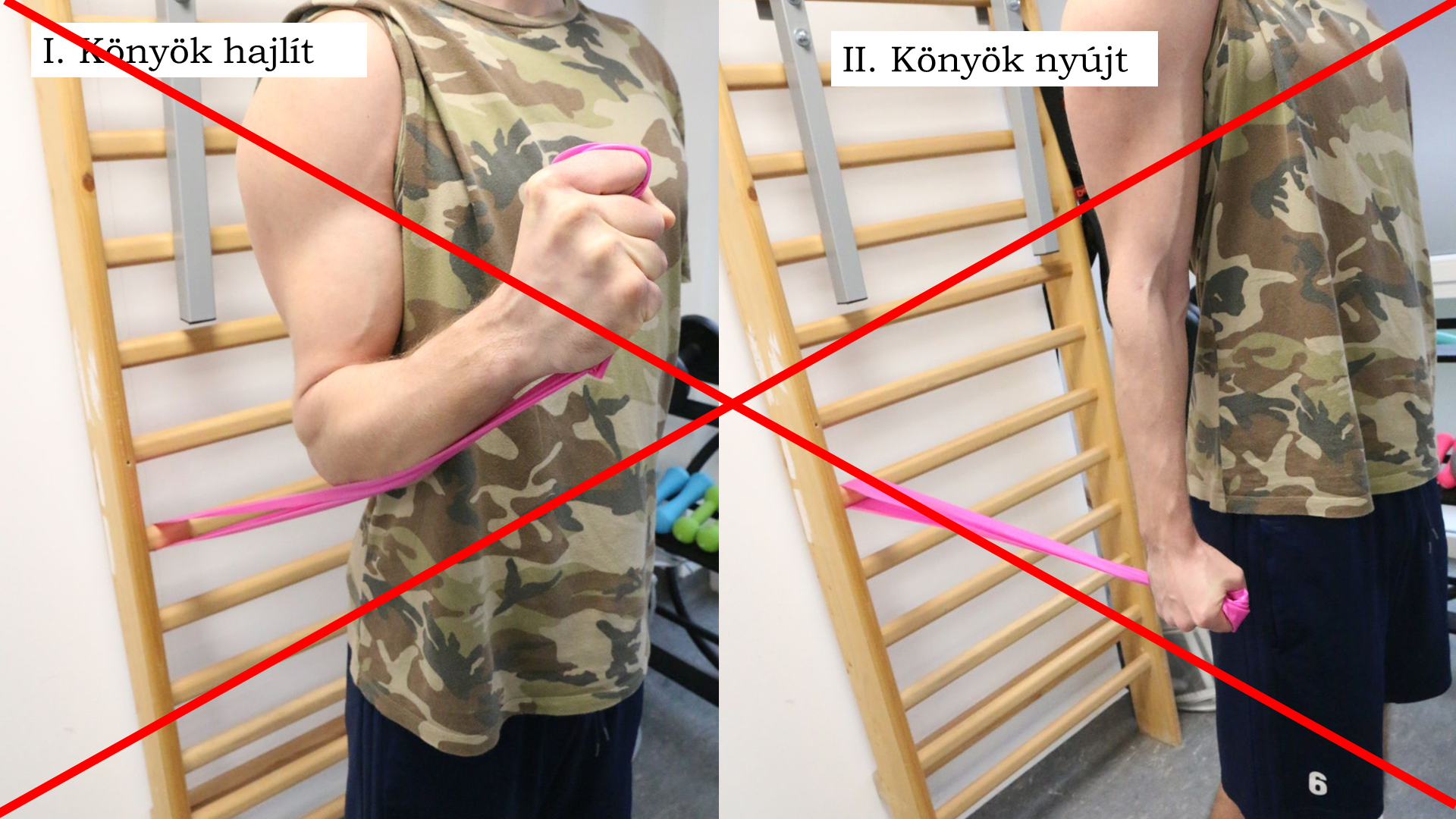 Nézzünk meg egy-egy biceps-es példát mindkettőre, hogy a leírtak pontosan érthetőek legyenek! Kiinduló helyzetben a páciens a bordásfalnak háttal áll, kezében egy, a bordásfalhoz rögzített szalag végét tartja, majd behajlítja a könyökét. Ebből a testhelyzetből fogja kinyújtani a könyökét és hátraengedni a karját.