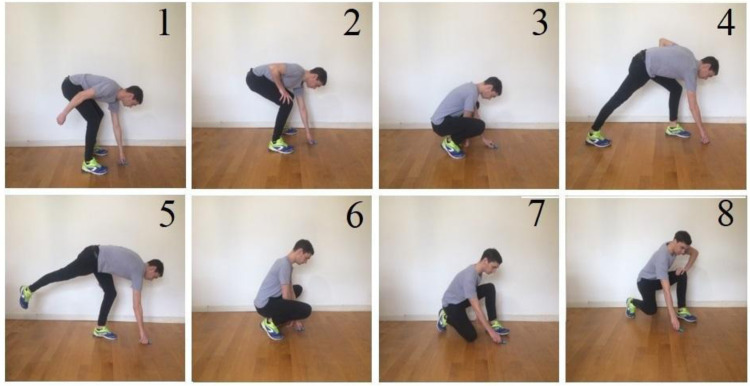 A nyolc mozgásstratégia egy könnyű tárgy földről történő felemelésére. A szakirodalom alapján mind a nyolc stratégia biztonságos a krónikus derékfájdalomban szenvedő, vagy derékfájós epizódot átélt páciensek számára. Forrás: Rialet-Micoulau és mtsai., Brazilian Journal of Physical Therapy (2022)