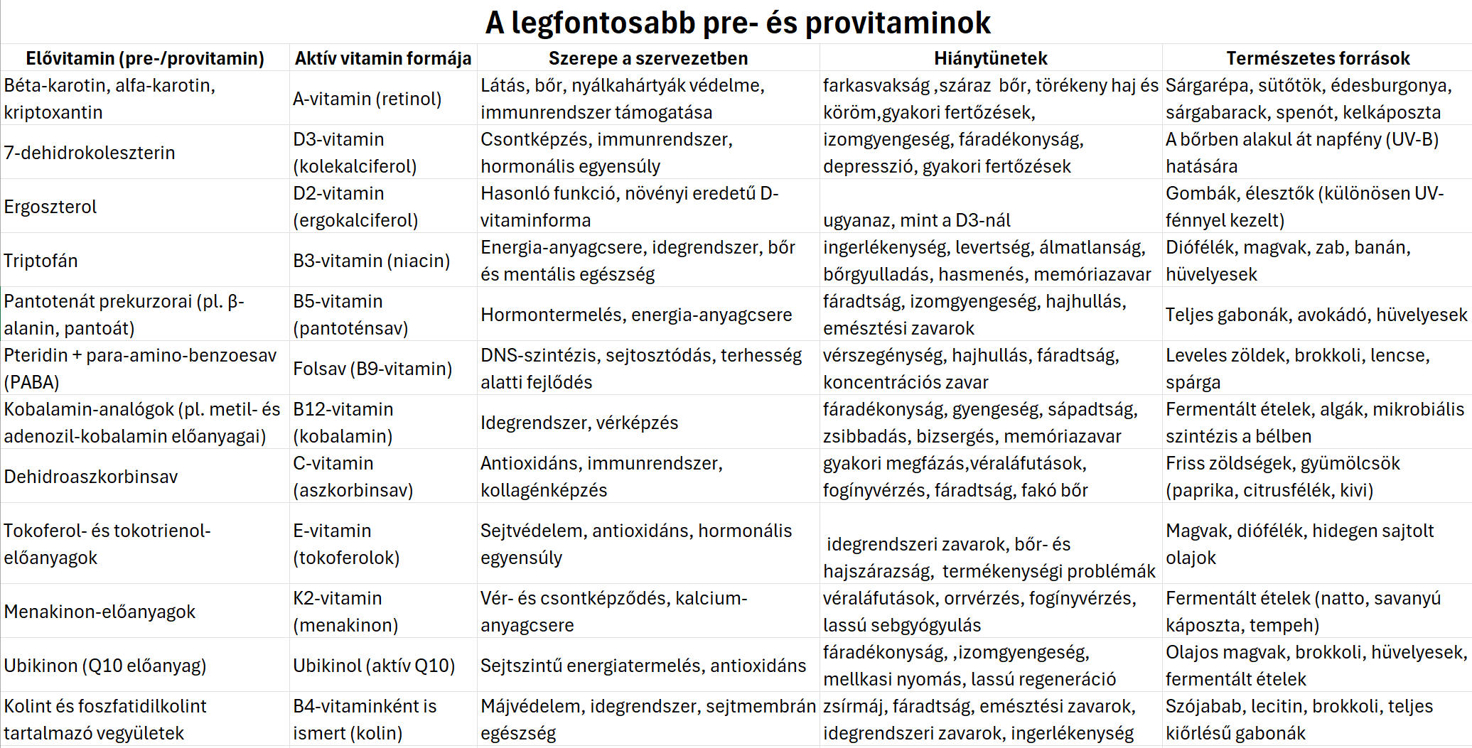 A pre- és provitaminok a test „nyersanyagai”. Önmagukban még nem aktív vitaminok, ám nélkülük nem működik a vitaminrendszer. A modern étrend általában szegény ezekben az előanyagokban, ezért rendkívül gyakoriak a hiánybetegségek. Az élő, friss, természetes ételek, a napfény és a sokszínű bélflóra jelentik a természetes forrást és védelmet a hiányállapotok ellen.